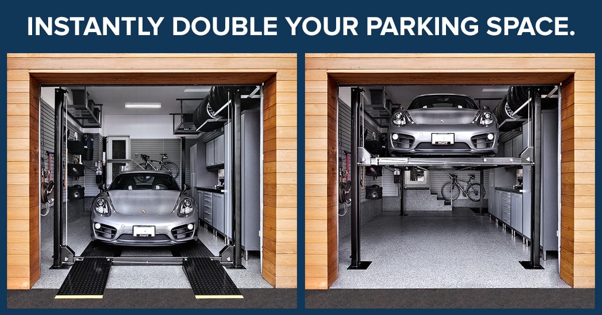 There’s a way to actually double your garage’s parking space without needing to undergo a major garage renovation – add a 4 post car lift. Homeowners are increasingly discovering the practicality of this smart garage vehicle storage solution.