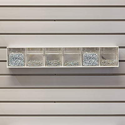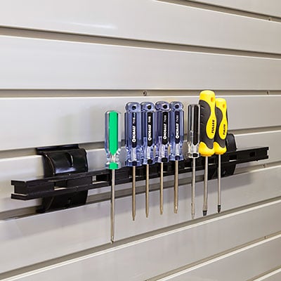 Once you know the desired location for your garage workshop, you can incorporate the slatwall panels and accessories around it. The following slatwall accessories are well-suited for keeping any work area organized: