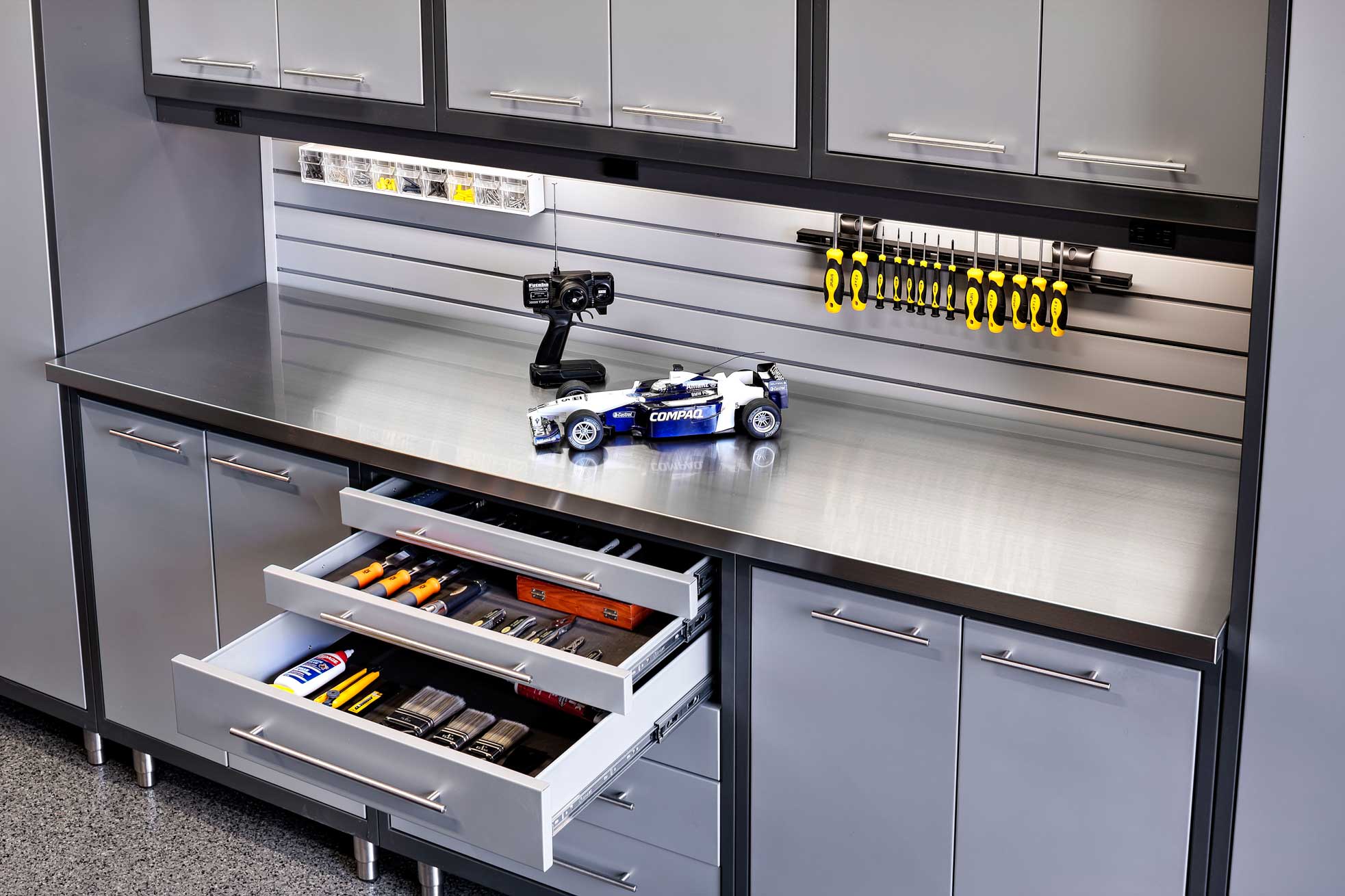 If you’re looking to set up a garage workspace that will get heavy use, one of our heavier-duty cabinet lines like the GL Rally model can be tailored for your garage space.